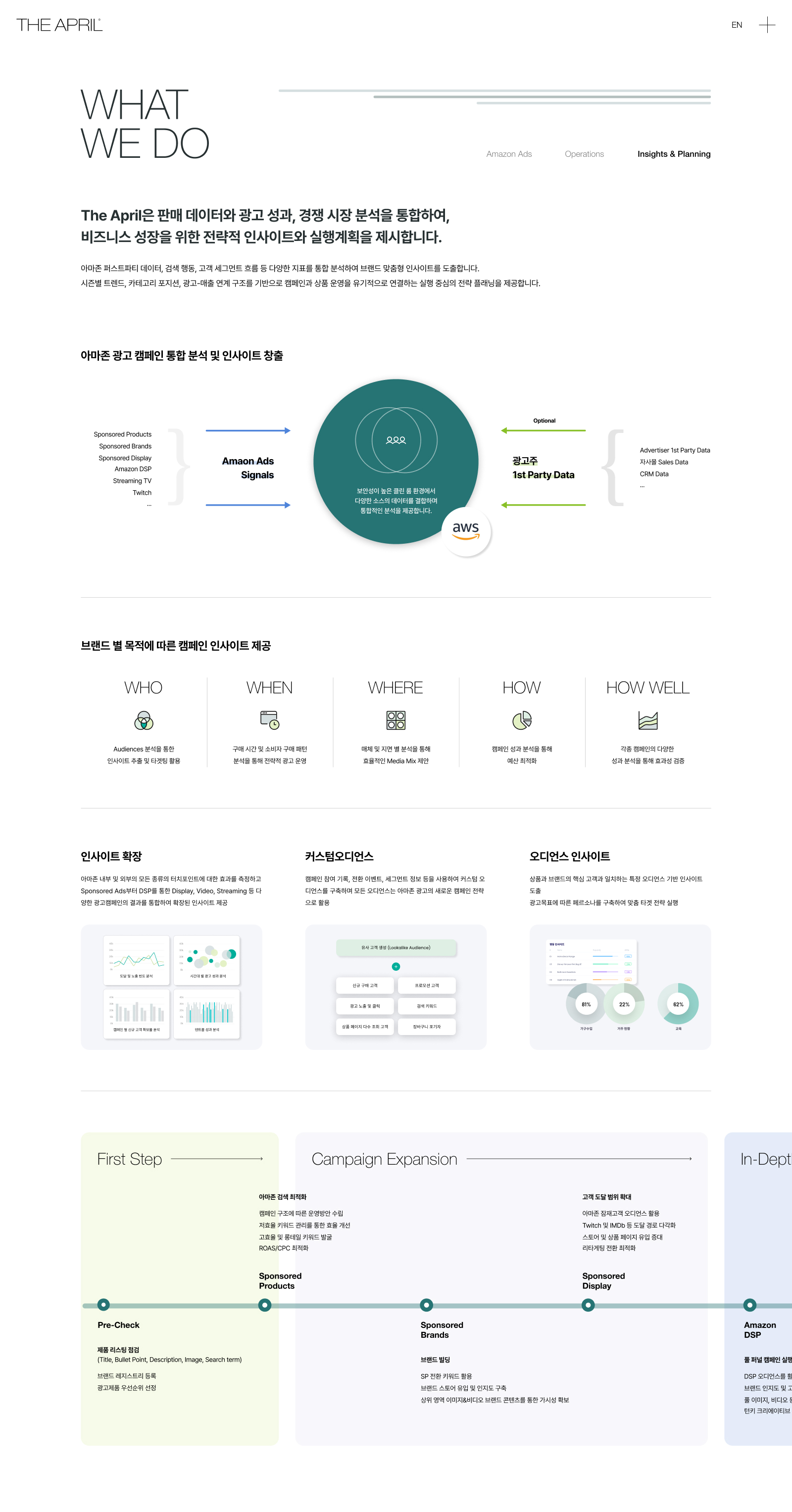 아마존 시장의 방대한 데이터를 분석하고 브랜드별 니즈를 파악하여, 최적화된 비즈니스 성장 전략을 파트너사들에게 일관되게 제공하는 프로젝트입니다. 데이터 기반의 전문성을 강조한 The April 웹사이트는 Full Funnel 관점의 직관적인 UX로 설계되었으며, 광고 성과와 판매 데이터를 통합한 고도화된 대시보드(Dashboard) 구현으로 효율적인 캠페인 관리와 운영이 가능합니다.