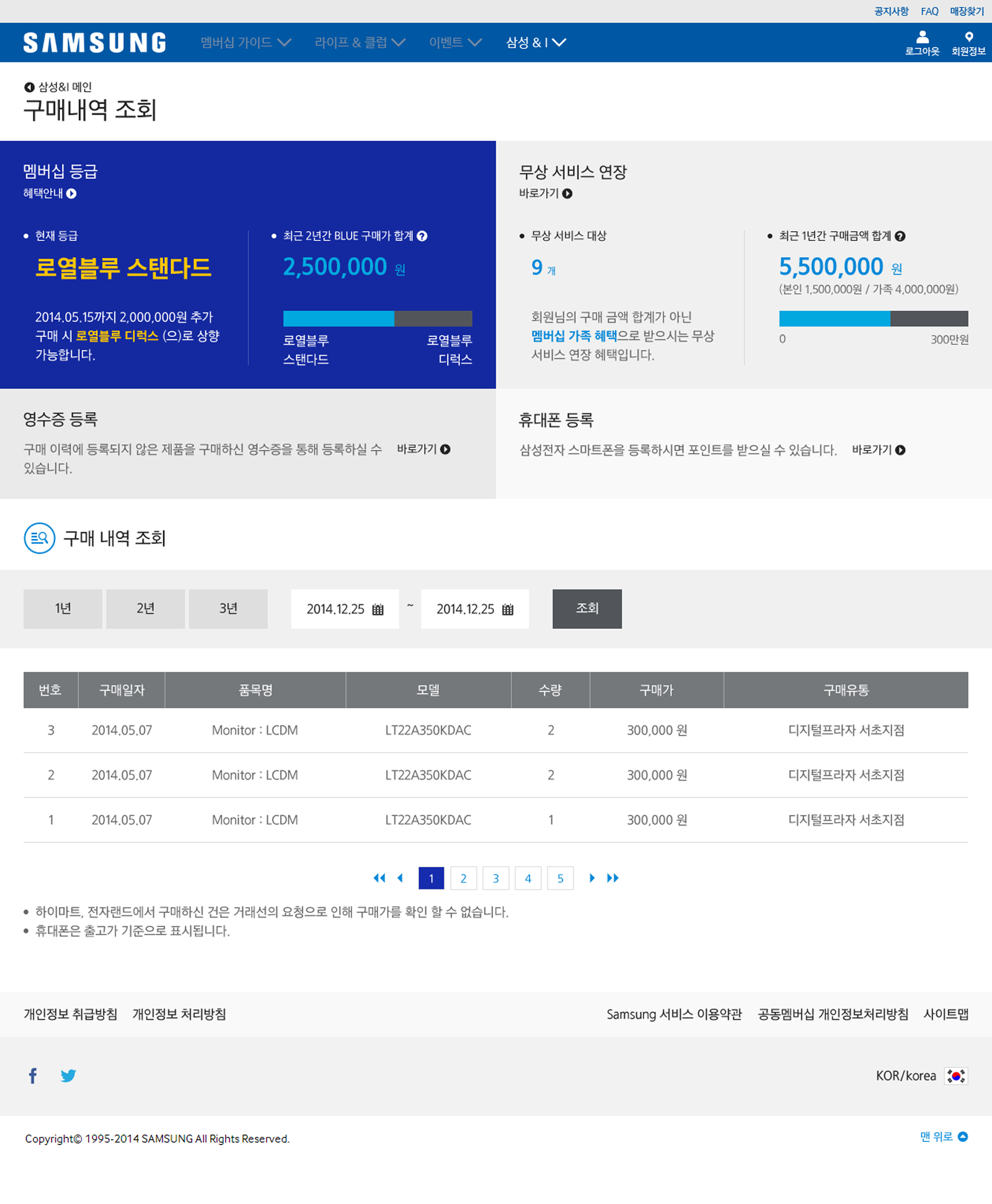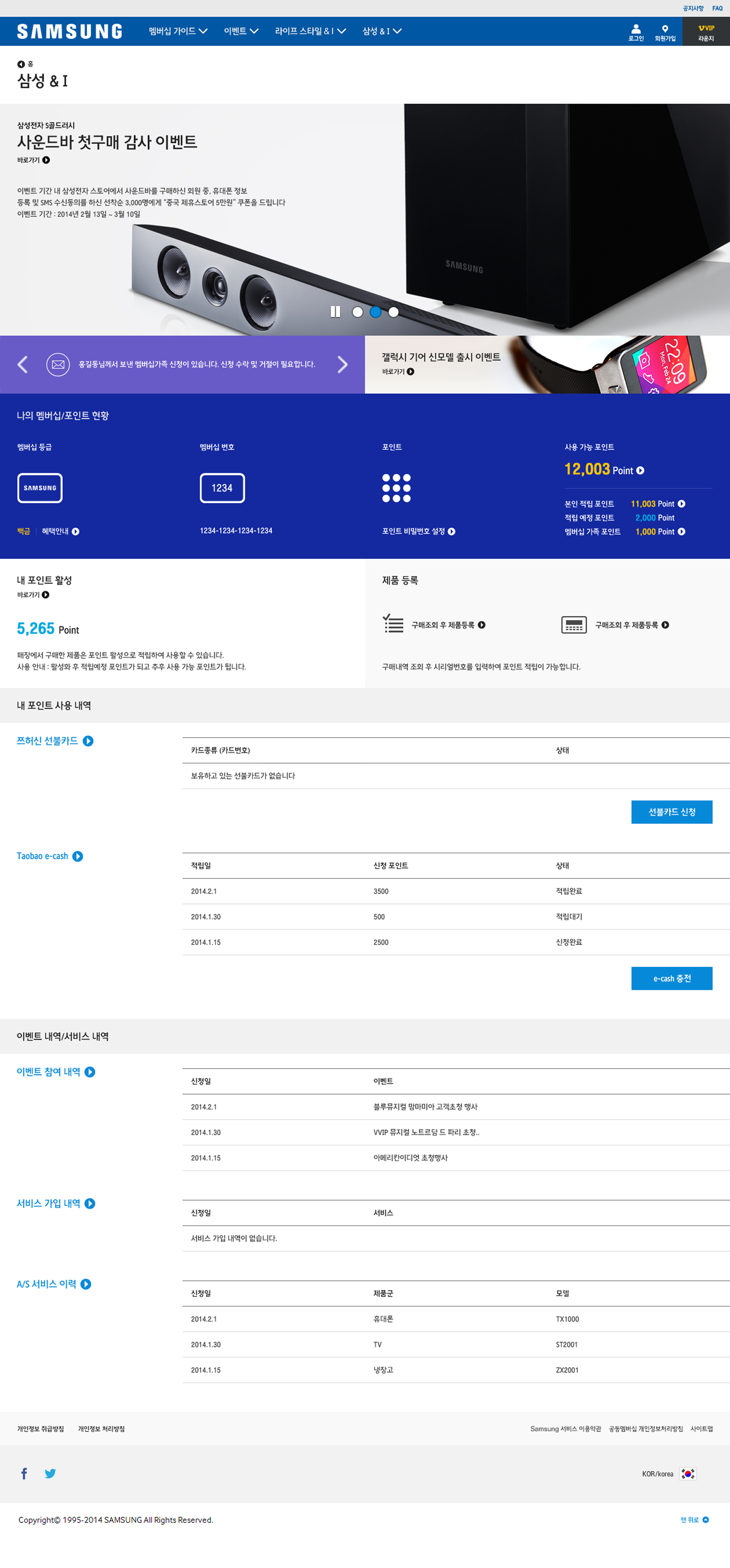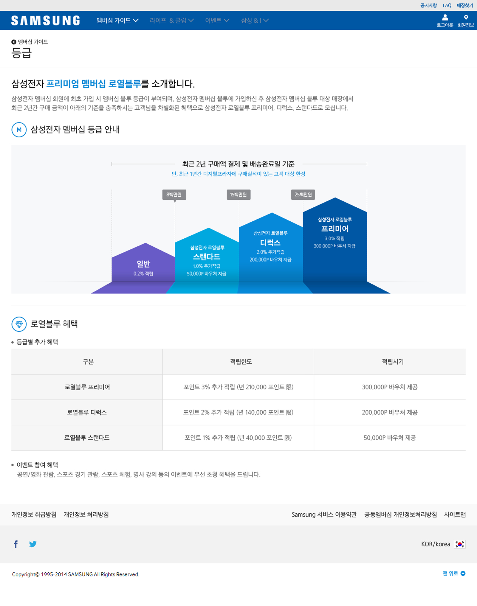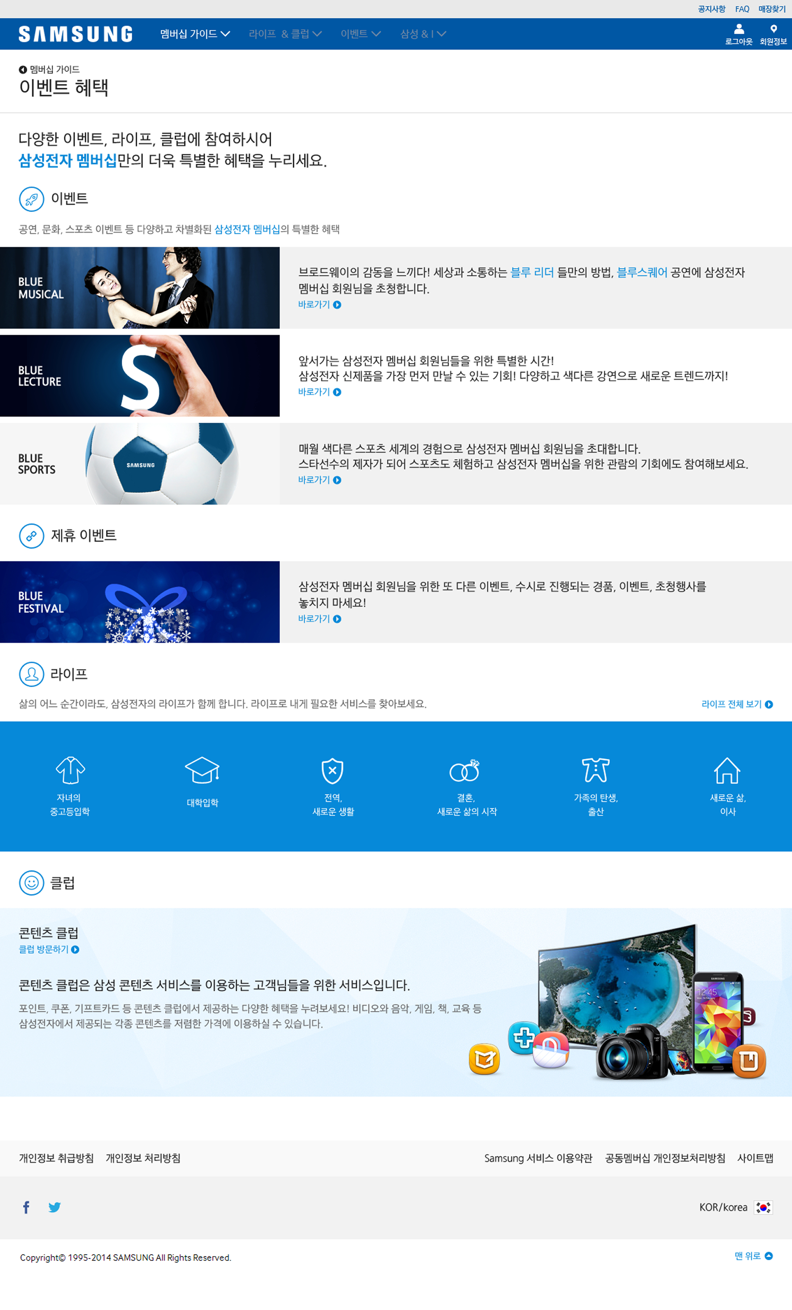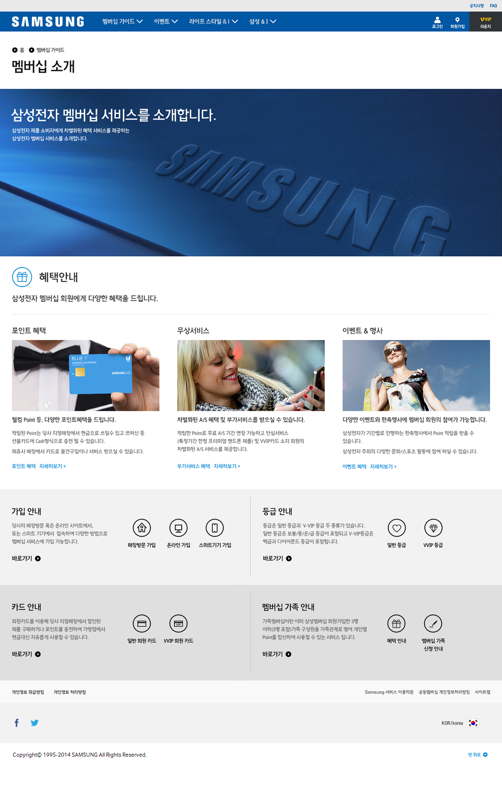 글로벌 멤버십 혜택과 서비스들을 하나의 플랫폼으로 통합하면서도, 삼성전자가 가진 고유의 신뢰감과 프리미엄 무드(DNA)를 훼손하지 않도록 설계되었습니다. 웹사이트의 Grid & Layout은 모듈형 카드 UI로 통일하여 개발 및 유지보수의 효율성을 높이고, 인포그래픽, 타이포그래피 등 시각 요소에 아이덴티티를 부여하여 전문성을 선명하게 드러내는 '프리미엄 블루(Premium Blue)' 컨셉을 지향합니다. 사용자가 어떤 하위 메뉴를 방문하더라도 네비게이션 위치, 혜택 안내 방식 등의 UI가 동일하여 즉각적이고 편안한 탐색이 가능합니다.